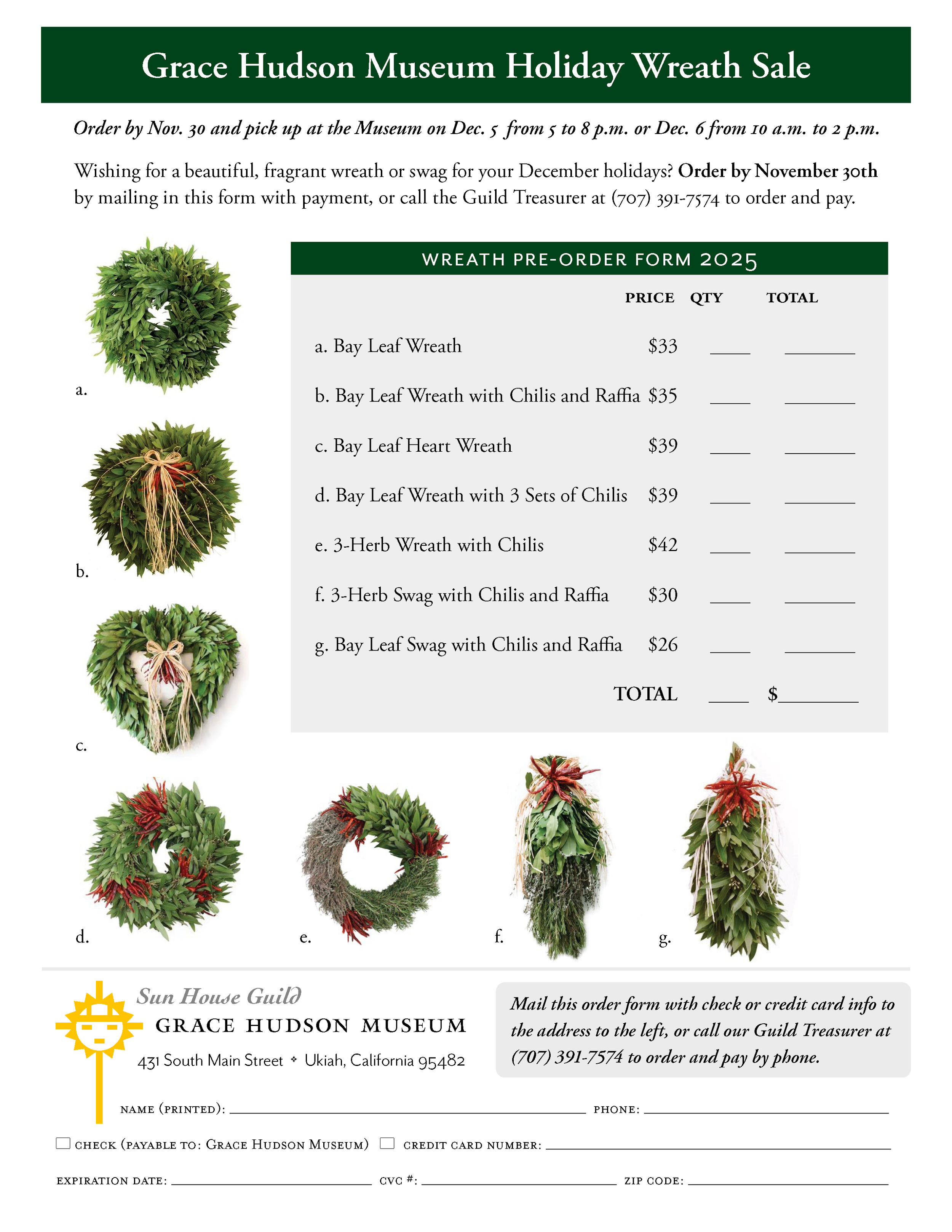 In anticipation of the the holiday season, the Museum will once again be selling beautiful and fragrant wreaths and swag at our holiday-themed December First Friday. We will have limited quantities, so it’s a good idea to pre-order. Click on the image to your left or the link below to access the pre-order form. Follow the instructions on the form, to make your selection(s) and payment.